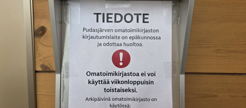 Pudasjärven kirjaston omatoimijärjestelmän kirjautumislaite on tällä hetkellä epäkunnossa ja odottaa huoltoa. Tästä syystä omatoimikirjaston käyttö ei ole mahdollista viikonloppuisin toistaiseksi.