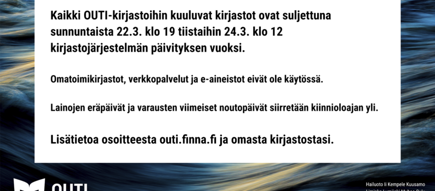 Verkkopalveluita, kuten OUTI-verkkokirjastoa ja Pohjoisen eKirjaston palveluita, ei voi käyttää sunnuntaista 22.3. klo 19 alkaen päivityksen aikana. OUTI-verkkokirjastossa voi selata kirjaston kokoelmaa, mutta saatavuustiedot eivät ole käytössä. Verkkokirjastoon ei voi kirjautua, eli omia asiakastietoja, lainoja ja varauksia ei näe eikä niitä voi muokata.