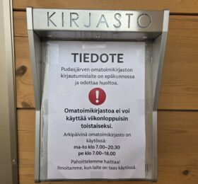 Pudasjärven kirjaston omatoimijärjestelmän kirjautumislaite on tällä hetkellä epäkunnossa ja odottaa huoltoa. Tästä syystä...