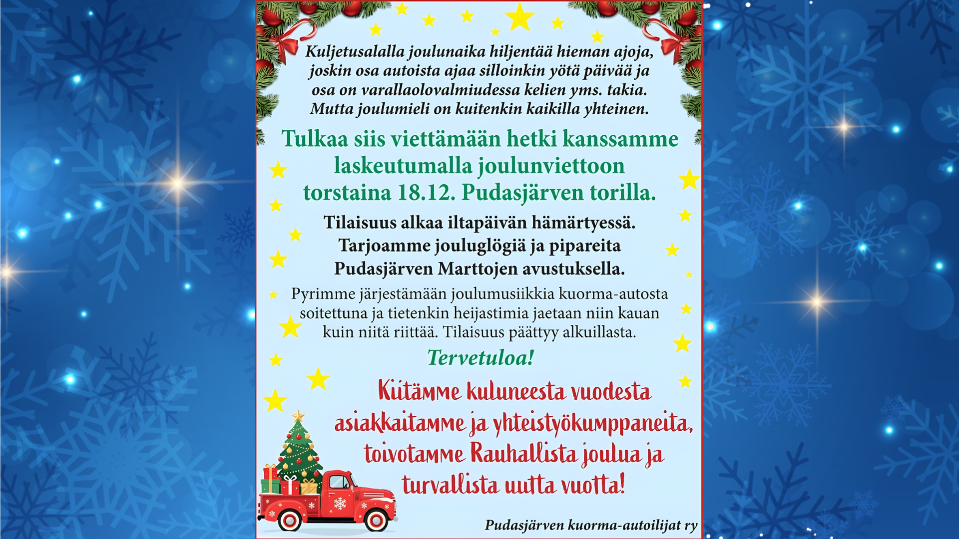 Pudasjärven kuorma-autoilijat ry tarjoaa torilla glögit ja piparit .