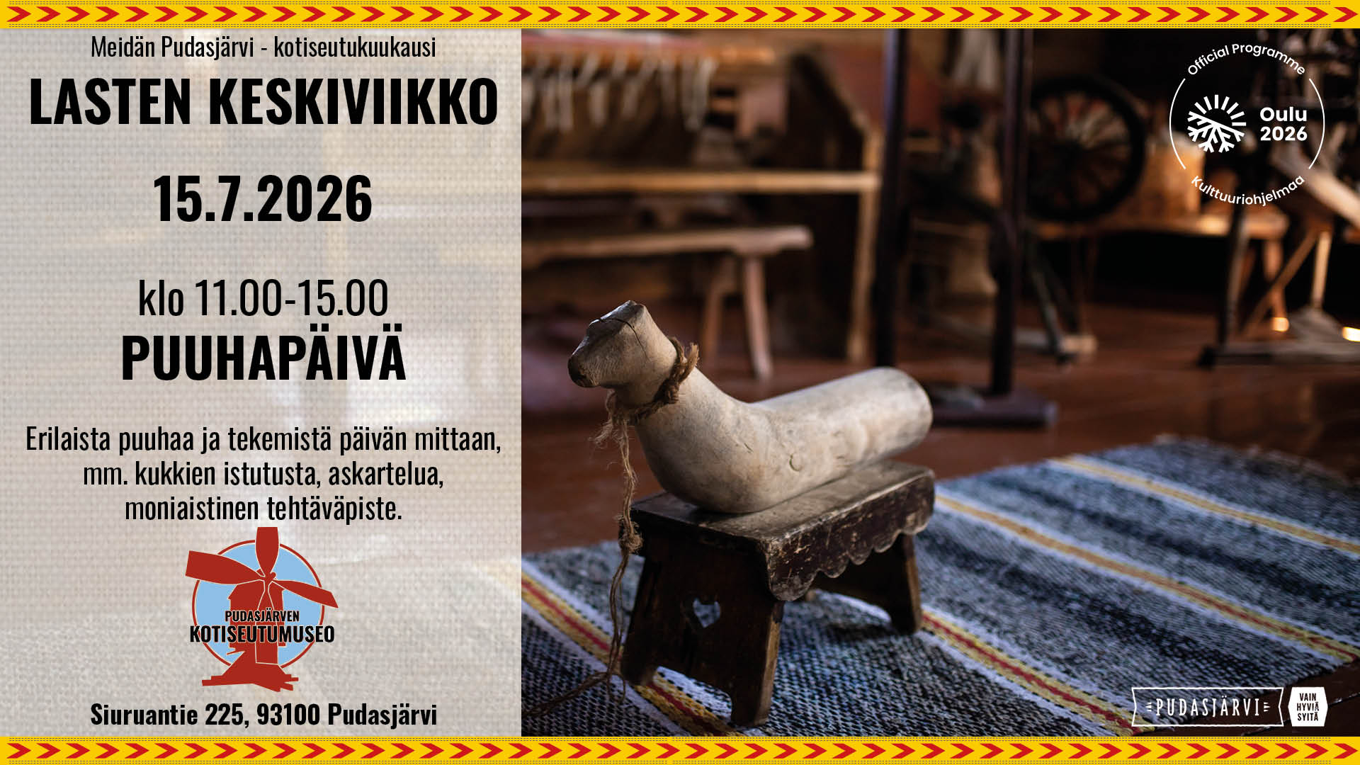 Pudasjärven kotiseutumuseon kesäkauden avajaiset 1.6.2026! Museolla avautuu Makasiinin vaihtuvan näyttelyn tilassa uusi hirsiaiheinen näyttely. Avajaispäivänä museo tarjoaa kahvit klo 14-16 ja kahveilta pääset suoraan katsomaan Nätti-Jussista kertovaa esitystä. Esitys alkaa […]
