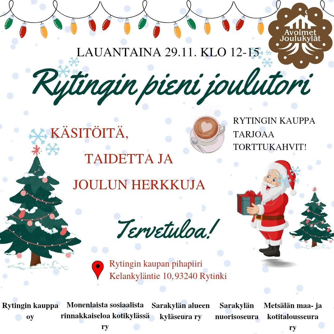 Tule hakemaan joulumieltä ja joulun taikaa Rytingin kaupan piha-alueelta la 29.11. klo 12–15 🎅🎁 Kauppias tarjoaa joulukahvit! Myynnissä paikallisia herkkuja ja käsitöitä. Kauppiaan lisäksi tapahtumaa ovat järjestämässä neljä alueen yhdistystoimijaa. Nähhään Rytingin pienellä joulutorilla! ❤️🎶 Tapahtuman järjestäjä: Rytingin kauppa oy, Monenlaista sosiaalista rinnakkaiseloa kotikylässä ry, Metsälän maa- ja kotitalousseura ry, Sarakylän alueen kyläseura ja Sarakylän […]